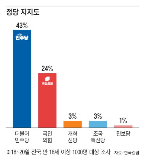 The Democratic Party of Korea received 43% support, the People Power Party had 24%, the Rebuilding Korea Party 3%, the Reform Party 3%, and the Progressive Party 1%. The Democratic Party saw a one percentage point increase from the prior week, whereas the People Power Party’s support stayed the same.